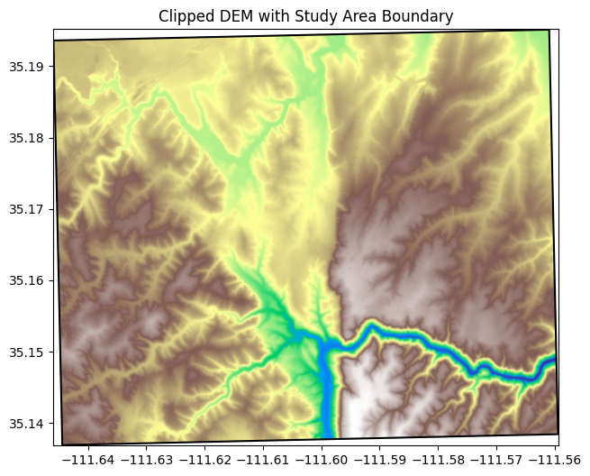 print(f"Clipped DEM saved to: {dem_clipped_path}")Clipped DEM saved to: data/derived\study_area_dem_clipped.tif